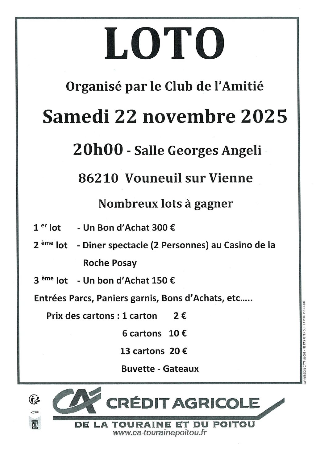 Le loto organisé par le Club de l’Amitié aura lieu le samedi 22 novembre 2025 à 20 h 00 à la salle des fêtes Georges Angéli.