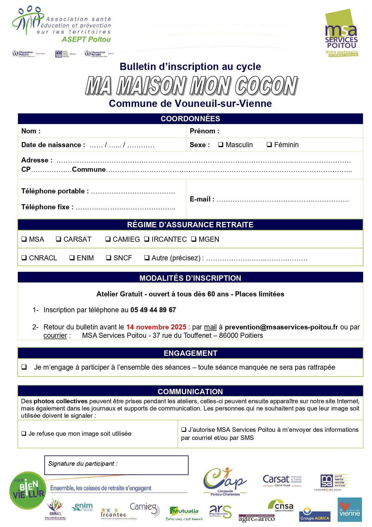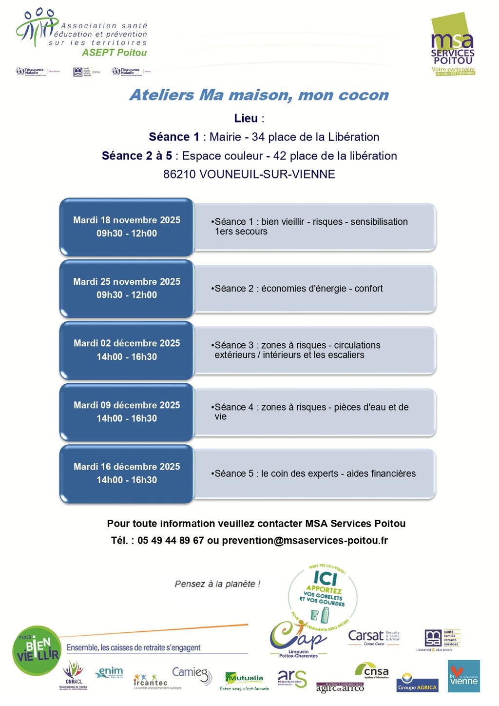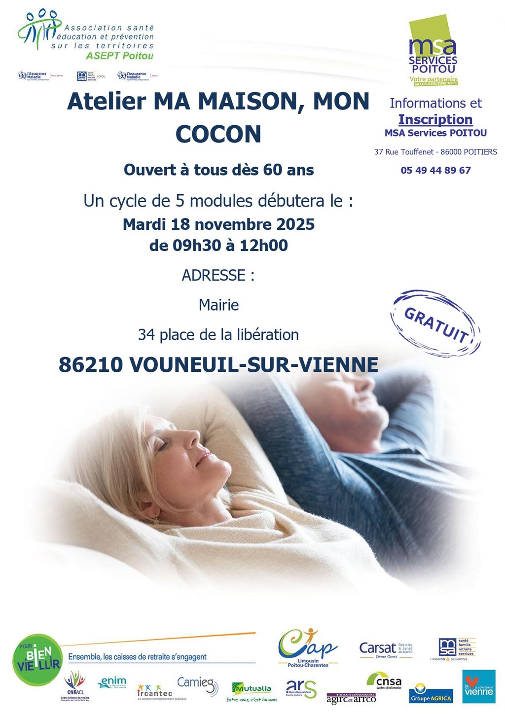 La MSA propose un atelier Ma Maison Mon Cocon composé de 5 modules, qui commencera le MARDI 18 NOVEMBRE 2025, le premier module aura lieu à la Mairie et les suivants à l'Espace Couleurs, situé au 42 place de la Libération, 86210 VOUNEUIL-SUR-VIENNE.