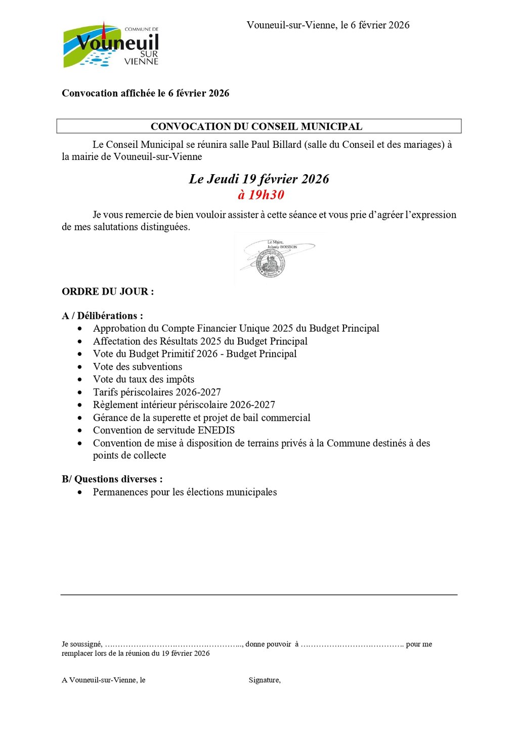 Le Conseil Municipal se réunira salle Paul Billard (salle du Conseil et des mariages) à la mairie de Vouneuil-sur-Vienne :
