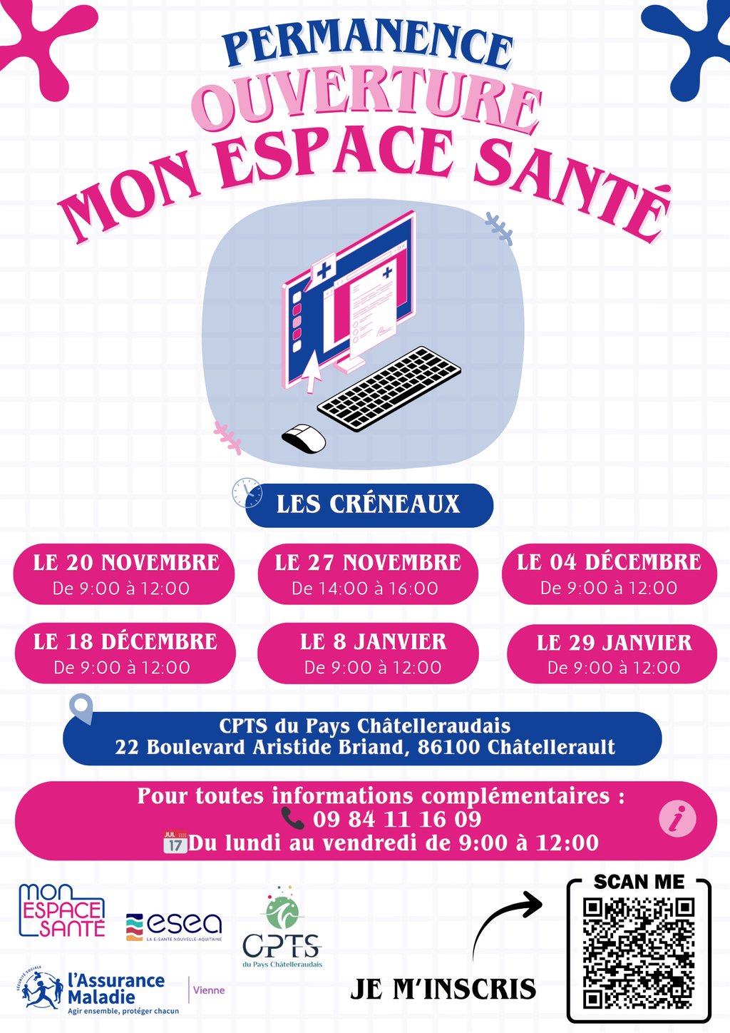 Dans le cadre d'un partenariat avec l'ESEA et la CPAM 86, des ateliers d'accompagnement à l'ouverture de "Mon Espace Santé" s'organisent sur plusieurs dates. Ces ateliers sont à destination du grand public sur inscription.