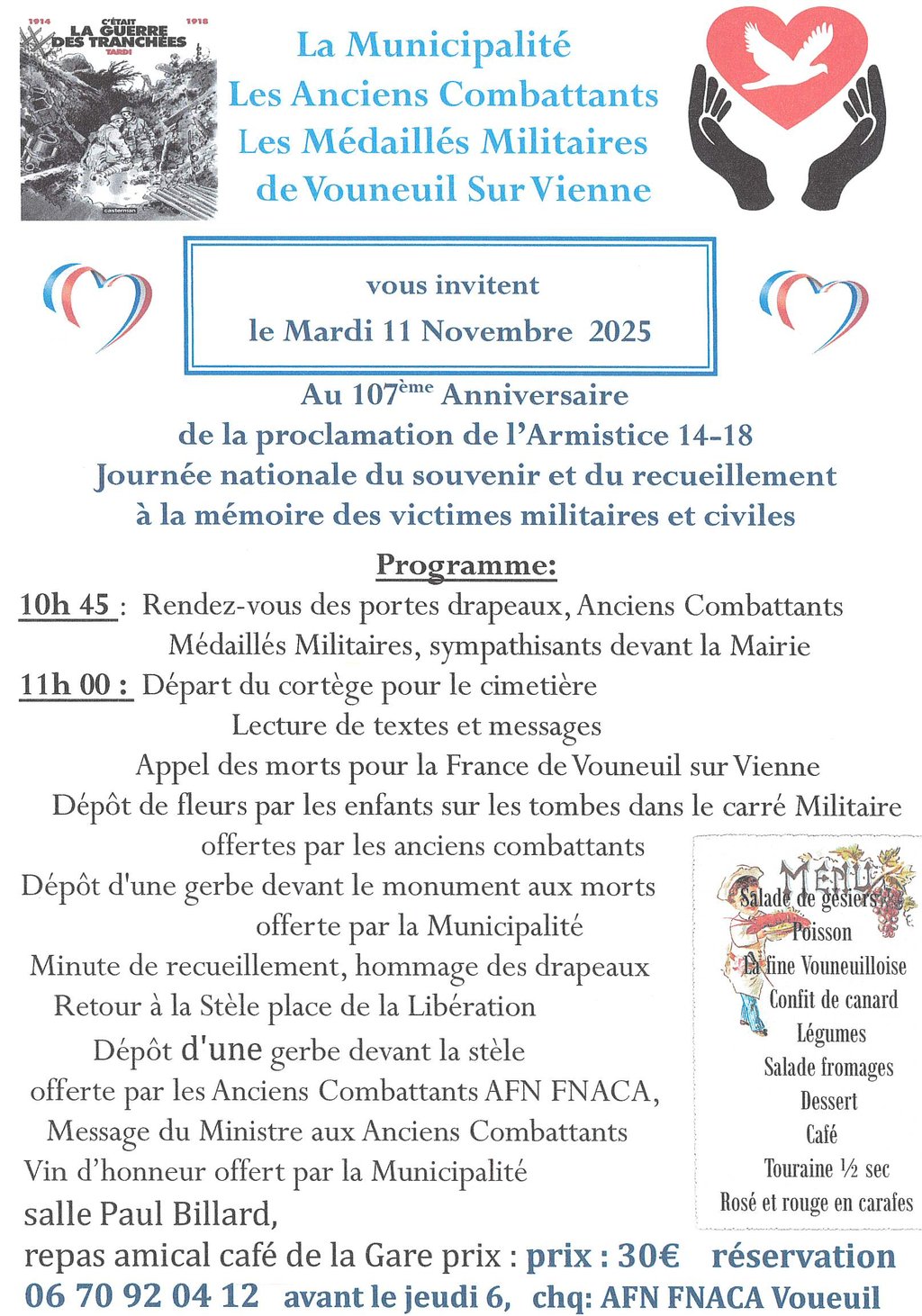 La Municipalité, Les Médaillés Militaires, les Anciens Combattants vous invitent au 107ème anniversaire de la proclamation de l’Armistice 14-18.