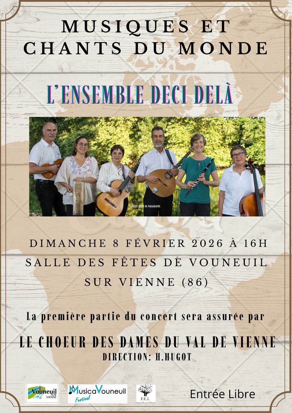 Le festival "MusicaVouneuil" vous invite à faire le tour du monde en musique avec l'ensemble Deci-Delà de Poitiers et le chœur des Dames du Val de Vienne.